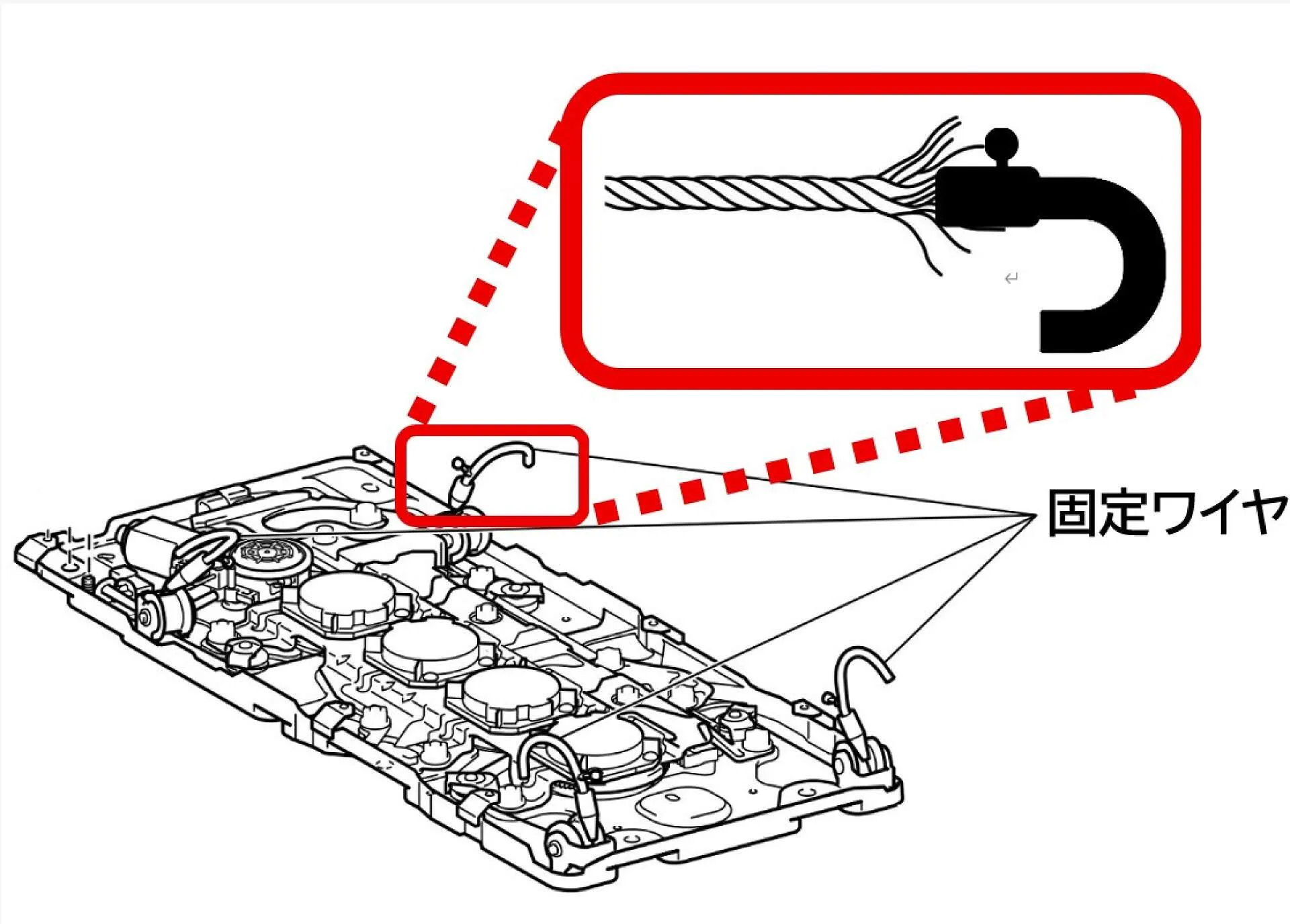 ■固定フックの根元部分は、使用に伴いワイヤーの素線が切れ、ささくれ(ほつれ)が生じることがあります。 以下の理由により、ほつれが確認できた段階での部品交換を推奨しております。